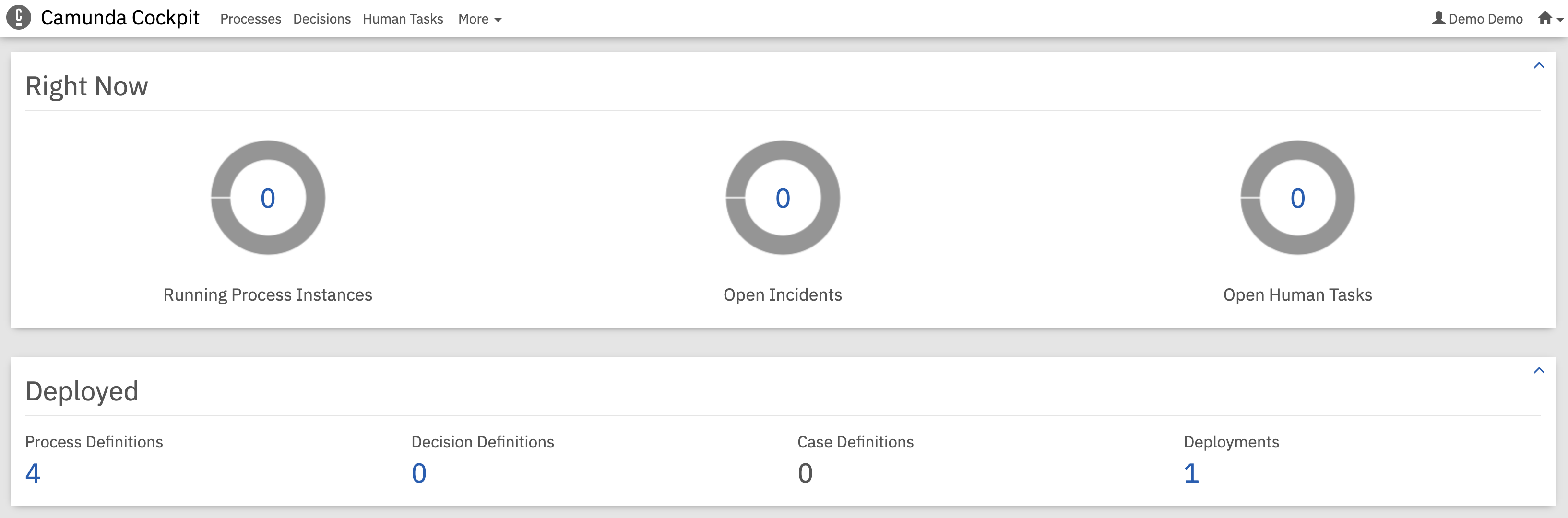 . Click Cockpit, where you’ll notice the four appropriate process instances are running from our application.