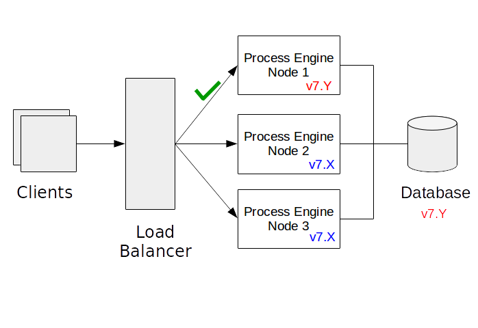 During the rolling update process, it is not permitted to use new features of the newer engine version. This means that it is not possible to “roll out” a new version of the BPMN processes or of the application making use of new API methods while also updating the library. The reason for this is that while performing a rolling update, there is a time frame in which both older and newer versions of the process engine library operate on the database concurrently. During this time, usage of new features of the new engine like deployment of a BPMN process with a newly supported symbol would cause problems with the old engine.