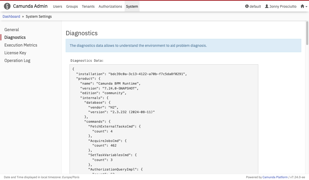 The System Settings menu gives you general information about the process engine. It enables users with system permissions to access certain system information, including diagnostics, metrics, and license key. Provided that you are using the Enterprise Edition of Camunda 7, you can also insert your License Key.