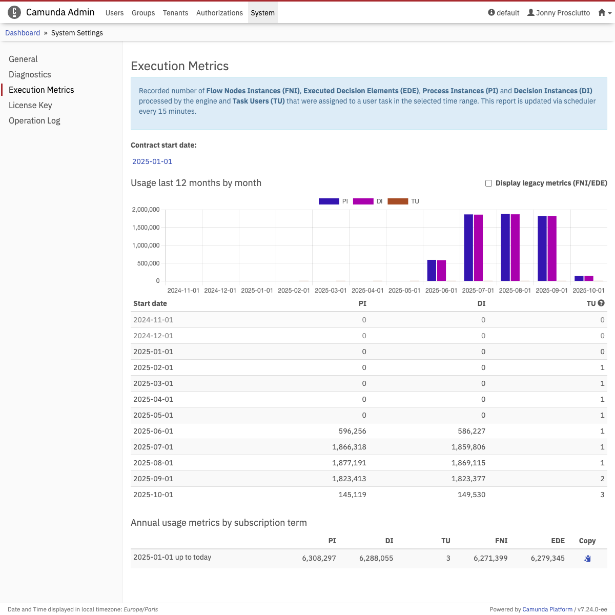 The Execution Metrics menu in Admin displays an approximate number of Flow Nodes Instances (FNI), Executed Decision Elements (EDE), Process Instances (PI) and Decision Instances (DI) processed by the engine and Task Users (TU) that were assigned to a user task by the selected contract start date.
