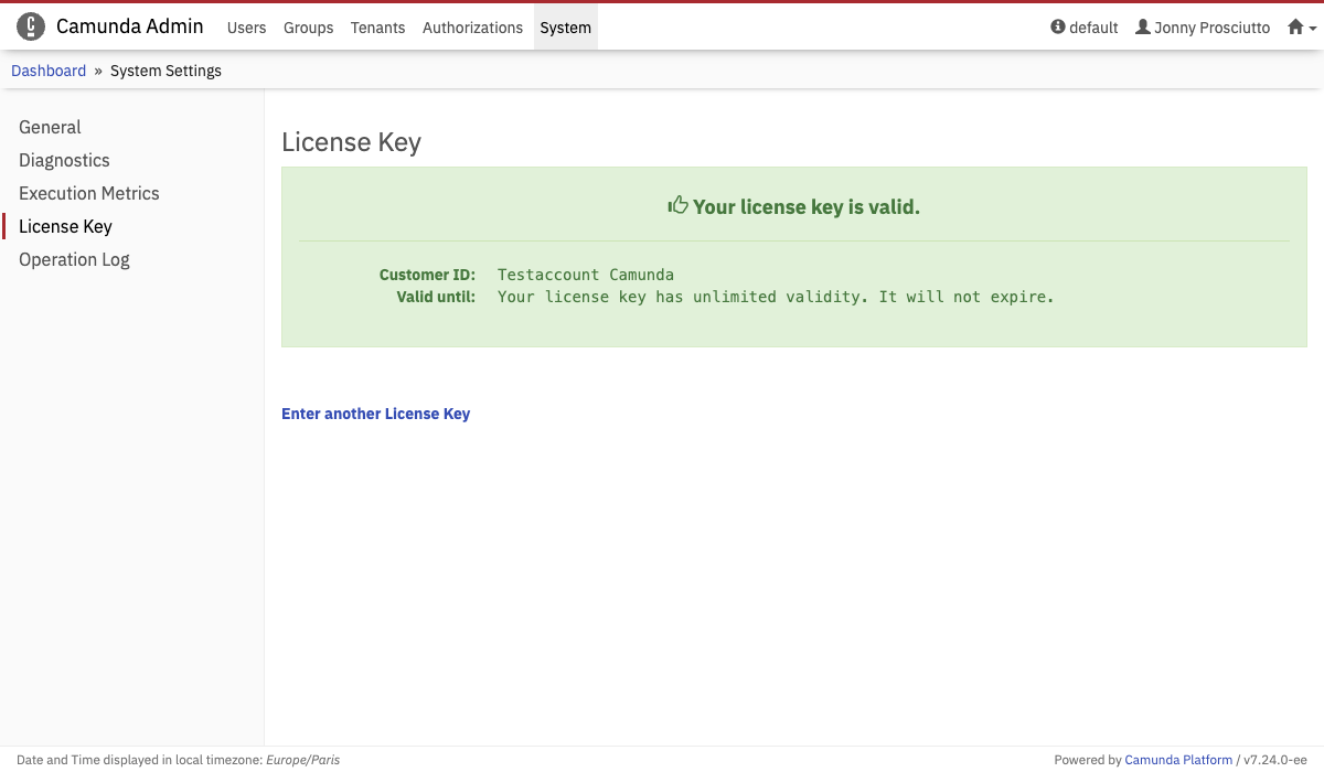 If you have administrator authorizations, insert your company’s license key for Camunda 7 and view some License Key details such as the Company Id and the validity of the license key. The Admin system setting menu offers the possibility to enter additional licenses, for instance when your existing license is expiring and you want to enter a new license key.