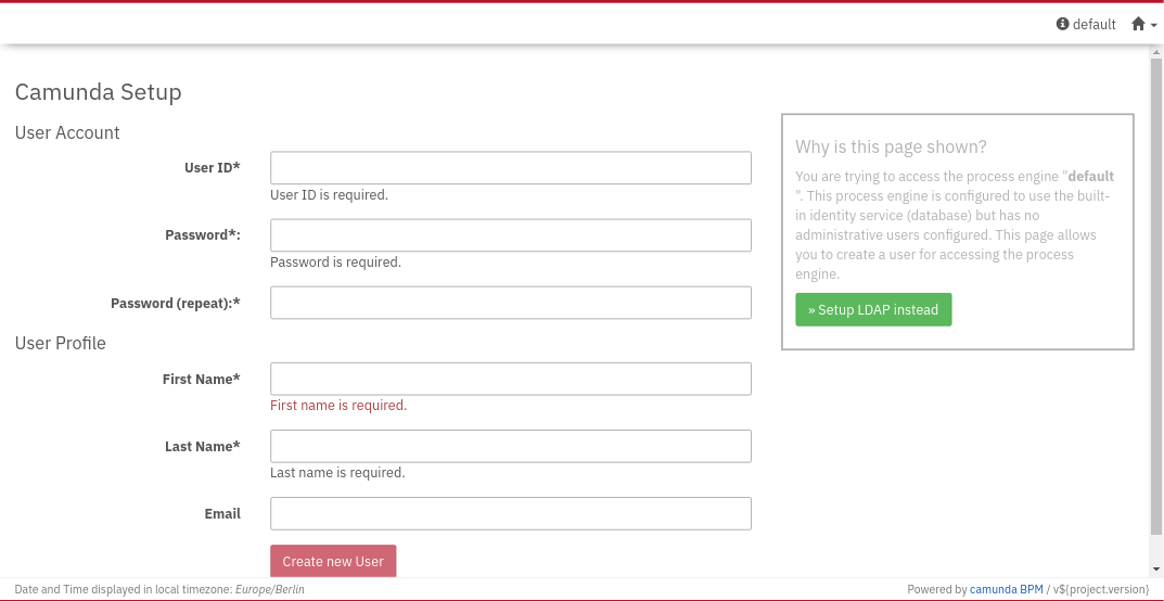 If no administrator account is configured, a setup screen will be shown on first access of a process engine through Cockpit or Tasklist . This screen allows you to configure an initial user account with administrator rights. Administrator users are not global but per engine. Thus, you will need to set up an admin user for each separate engine.
