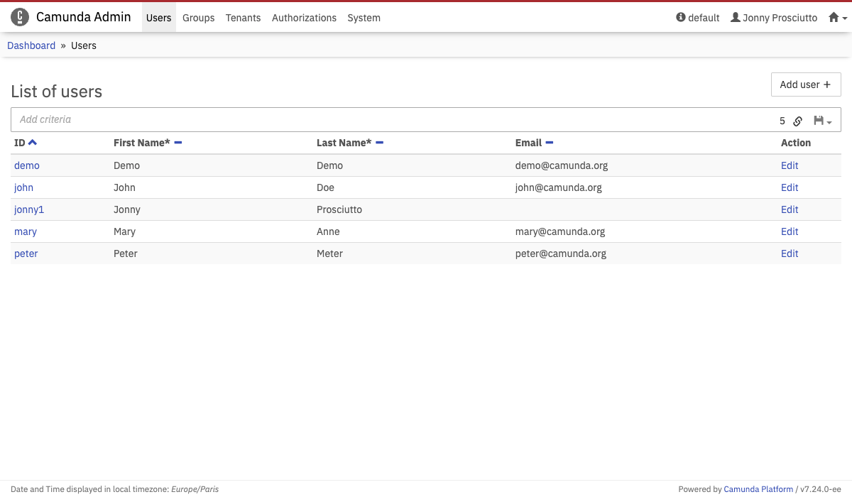 Users who belong to the group camunda-admin (default set by the invoice receipt demo process application) have administrator privileges. There must be at least one member in this group, otherwise the initial setup screen appears. Besides user- and groupmanagement, as administrator you are able to define authorization rules for a variety of resources. See the chapter on Authorizations for more details.