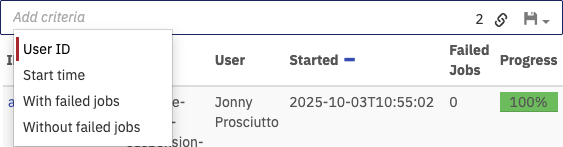 Above the in progress batches table, you can search for batches which fulfill certain search criteria. To do so, click in the search box and select the parameters to search for. You can also begin typing to find the required parameter faster. Depending on the selected property, you have to specify the value of the property. You can combine multiple search pills to narrow down the search results.