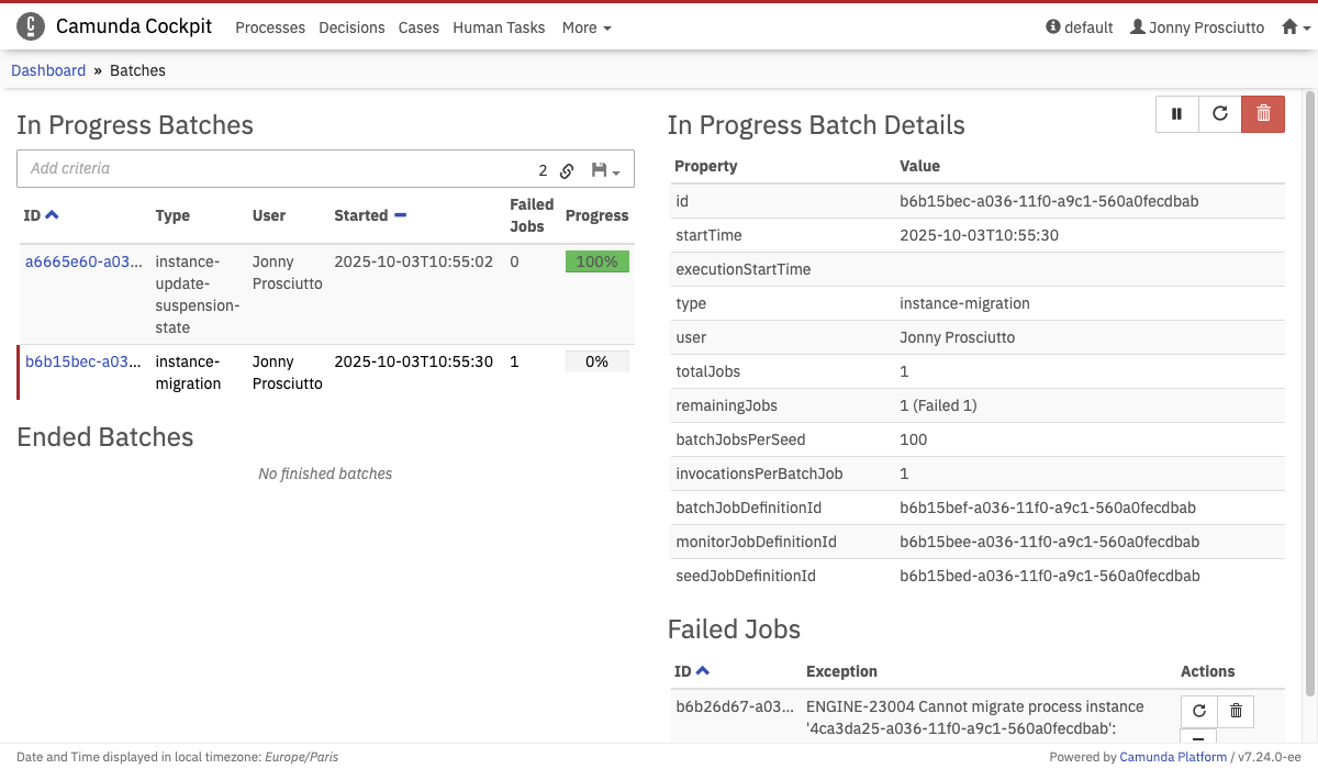 For batches that are currently in progress, the ID, type, user, started time, number of failed jobs as well as the progress is displayed. Please note that if a batch has failed jobs, the batch cannot be completed. You have to go to the details view of the batch and resolve the failed jobs (i.e., retrying or deleting them). Also, it can take some time after the progress is at 100% for the batch to actually finish. See the process engine section for details.