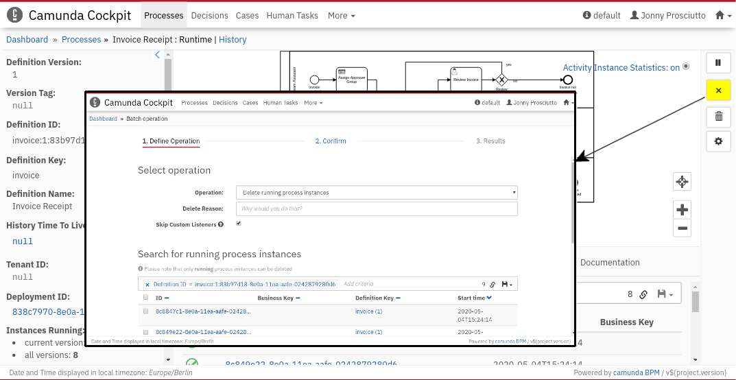 Delete multiple running process instances at once by using this feature. In the process definition view, hit the button on the right side. This opens a confirmation screen in which you can select which process instances to delete. You can apply filters to make it easier to find the desired process instances. In addition, it is possible to provide a reason for the delete. After you have selected which instances to delete and confirmed the delete, the runtime data of the deleted instances will be removed.