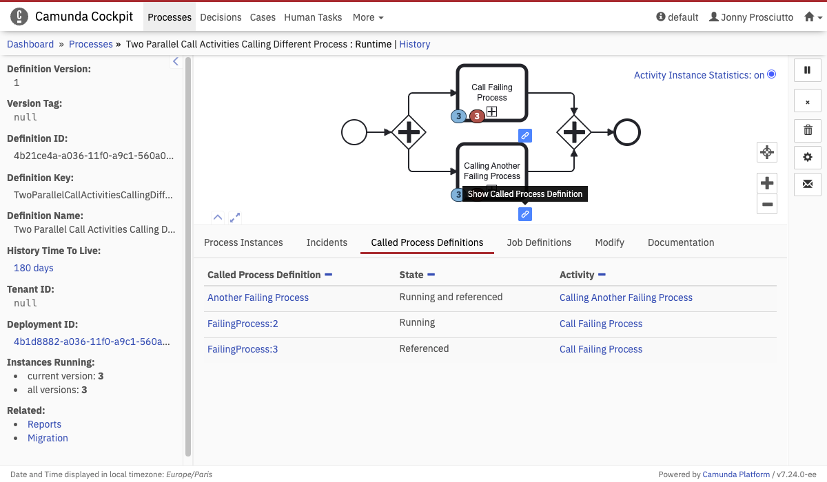 Additionally, you can use the called process definitions tab to get an overview of which call activity calls which process definition. We differentiate between three states: