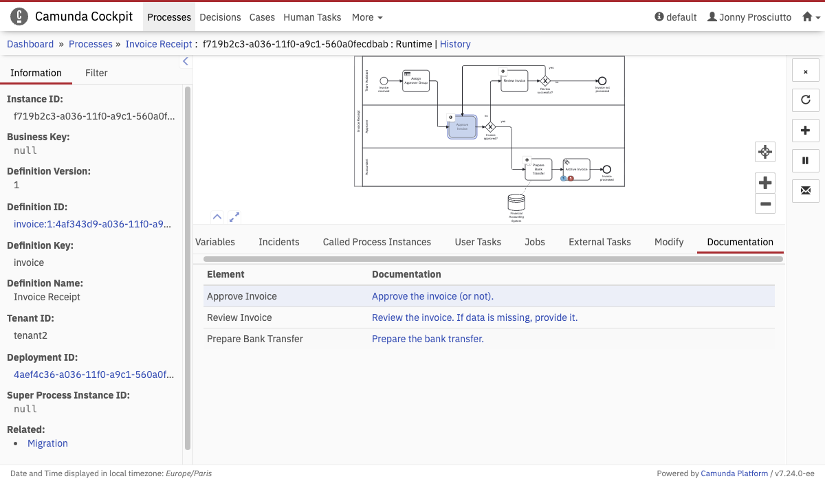 This feature allows you to inspect documentation added in the Camunda Modeler. To do so, open the Documentation tab. Elements with a documentation are indicated with a in the diagram. The documentation table lists all documented elements. Click on a table row to highlight the element in the diagram.