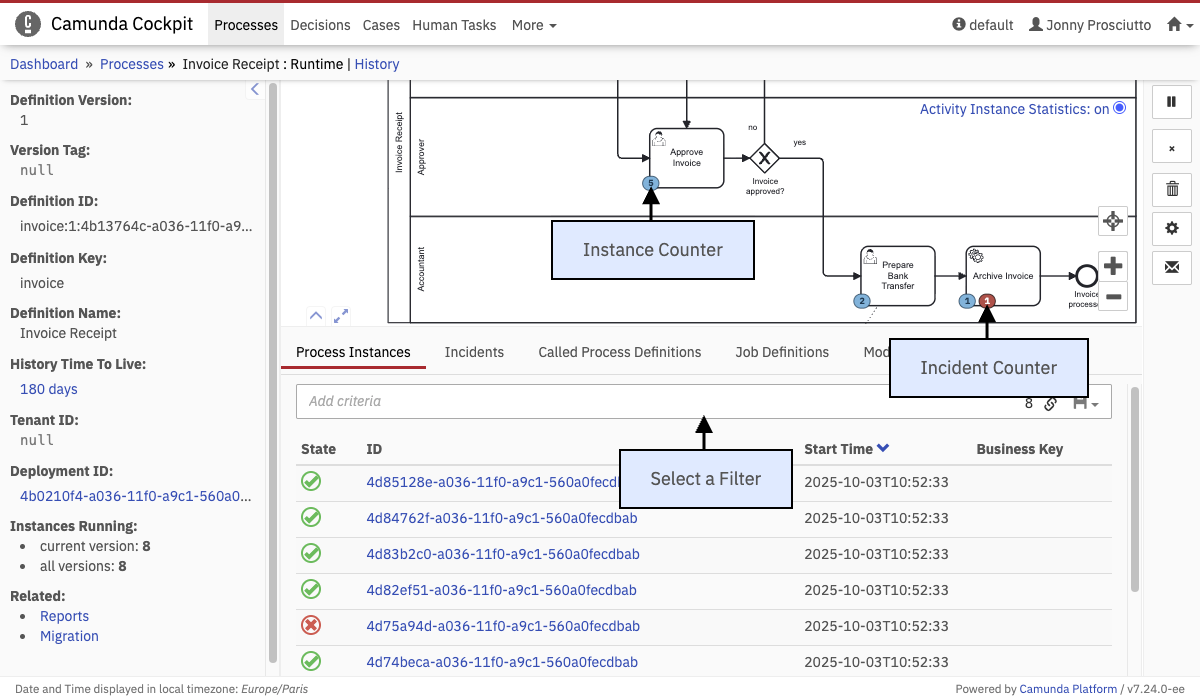 tab allows you to find certain instances by filtering for variables, business keys, activity IDs or date and time. In addition, you can filter for the process definition version by selecting the version of a process on the left side of the Process Definition View. Beyond that you can combine different filters as logical AND relation. Filter expressions on variables must be specified as variableName OPERATOR value