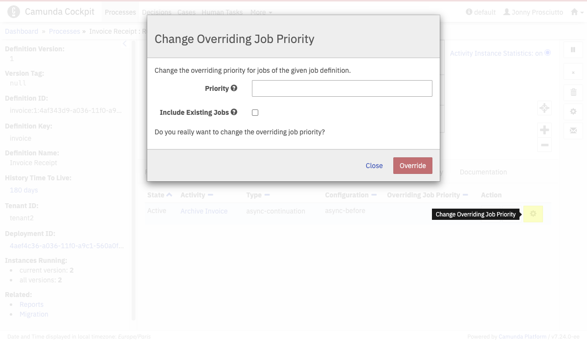 You can change the job priority by overriding the priority specified in the BPMN 2.0 XML. To do so, click on the