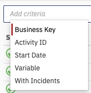 Add a filter to the process definition view. Select a filter for variables, the start date and time, activity ID or the business key of process instances.