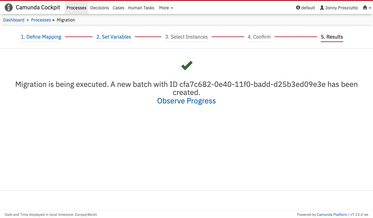 , the result screen is displayed. If the migration was performed successfully, that is indicated on this page. For asynchronous migrations, a link to the batch page is displayed where the progress of the batch can be observed.