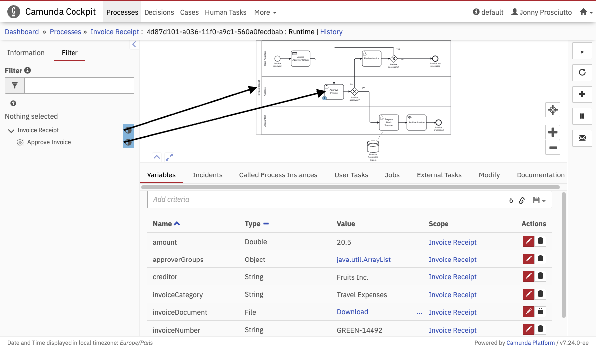Open the process instance view by selecting a process instance from the process definition view instance list. This view allows you to drill down into a single process instance and explore its running activities as well as the variables, tasks, jobs, etc. Beside the diagram view the process will be displayed as an activity instance tree view. Variables that belong to the instance will be listed in a variables table of the detailed information panel. Now you can select single or multiple (‘ctrl + click’) flow nodes in the interactive BPMN 2.0 diagram or you can select an activity instance within the activity tree view. As diagram, tree view and variables table correspond with each other, the selected flow node will also be selected in the tree and the associated variables will be shown and vice versa.