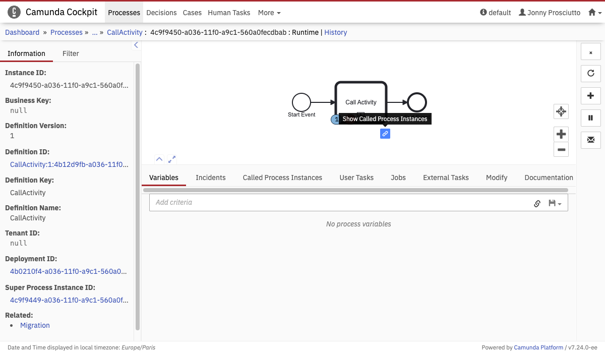 Use the detailed information panel to get an overview of the variables, incidents, called process instances, user tasks and external tasks that the process instance contains. Furthermore, you can access the instance modification tab. Depending on the selected activity instance in the rendered diagram, the panel lists the corresponding information. You can also focus on the activity instance via a scope link in the table.
