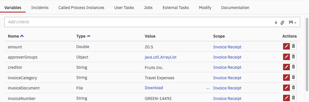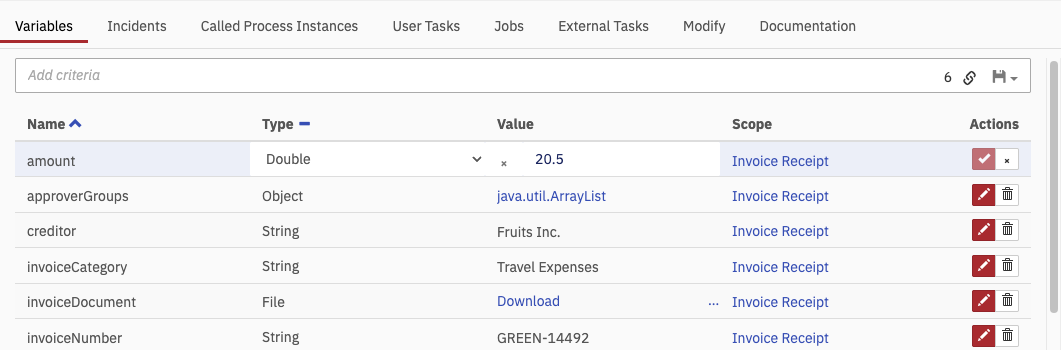 In the variables tab, you can filter for variables by variable name, activity instance id and variable value by using search pills. You can filter variable values with the type String