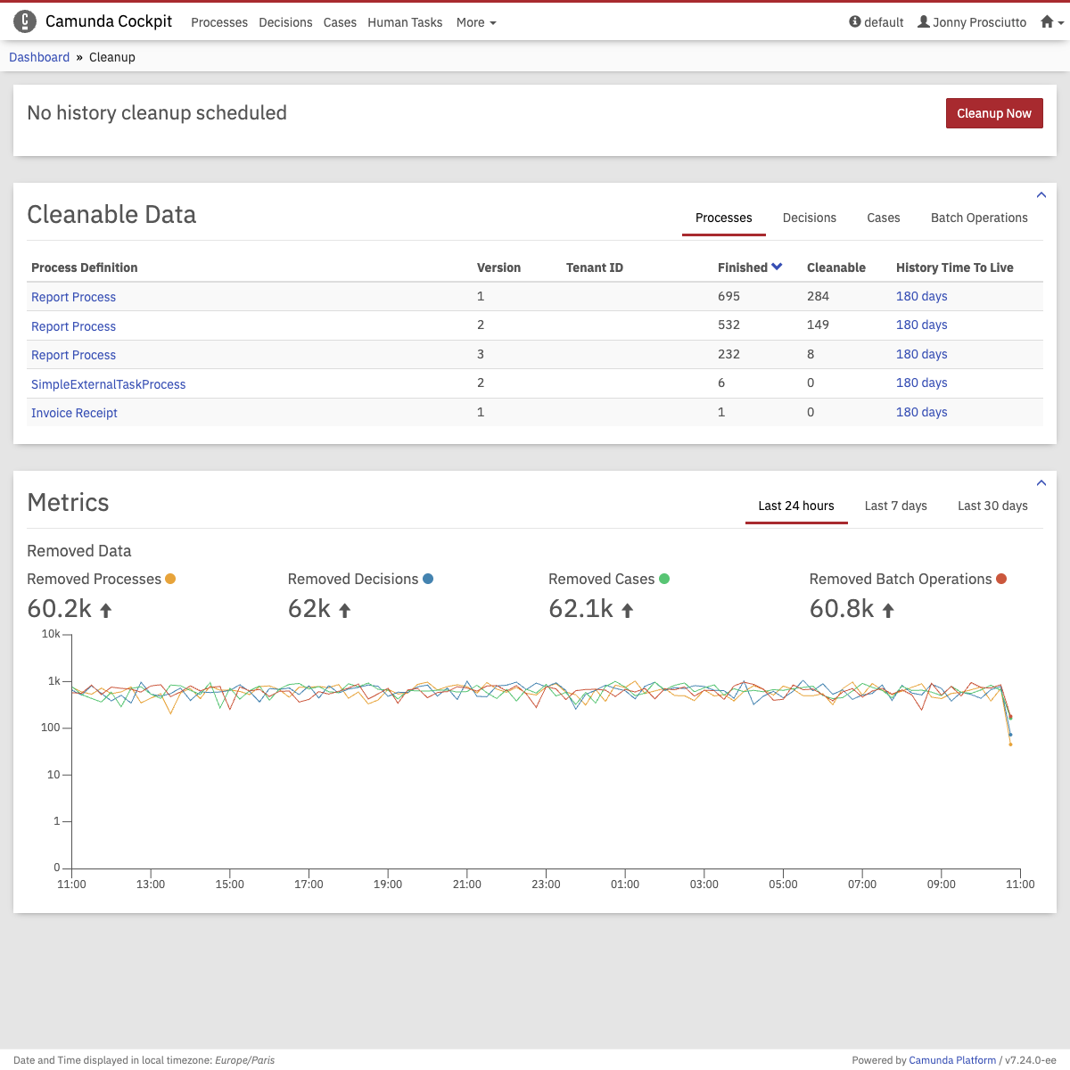If a history cleanup window is configured and scheduled, you can check out the remaining time for its start. Whether a window is scheduled or not, it is always possible to manually trigger a cleanup job.