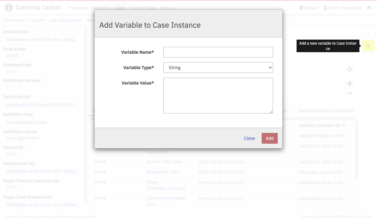 Hit the button on the right side to add variables to a case instance. You can choose between different data types. Please note that variables will be overwritten if you add a new variable with an existing name.