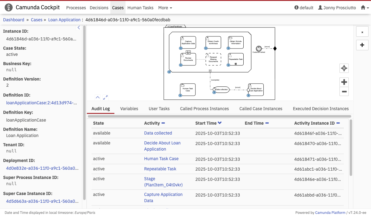 Open the case instance view by selecting a case instance from the case definition view instance list. This view allows you to drill down into a single case instance and explore its activities as well as the variables, tasks, etc.