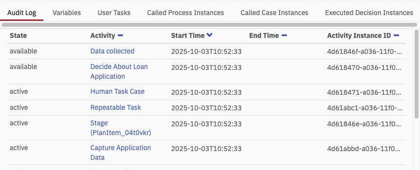 In the Audit Log you find a detailed overview of the activities that took place within the case instance, including start time, end time, activity instance ID and the current state.