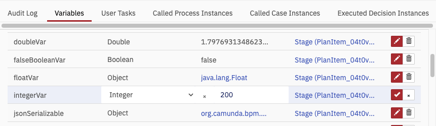 In the Variables tab you see an overview of the variables used within the case instances, including the name, last value, variable type and scope. Additionally, you can edit variables.