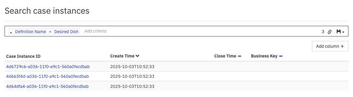 At the top of the dashboard, you can search for case instances which fulfill certain search criteria. To do so, click in the search box and select the parameters to search for. You can also begin typing to find the required parameter faster. Depending on the selected property, you have to specify the value of the property. Some properties also allow operators other than equal, e.g., like