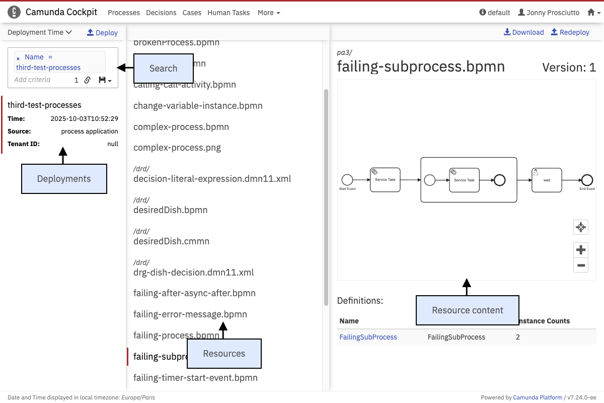 Use the search field at the top of the list of deployments to find specific deployments. Similar to the search on the cockpit dashboard and in tasklist, it is possible to search deployments using an array of available criteria.