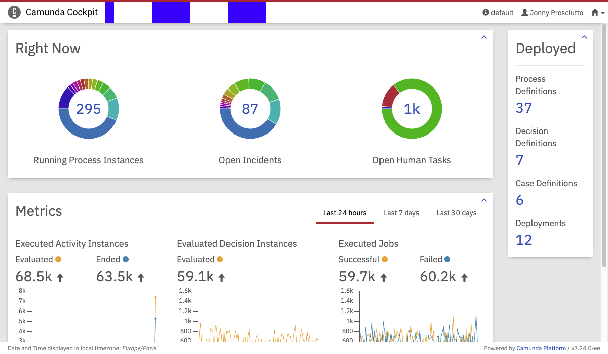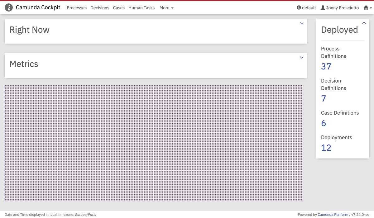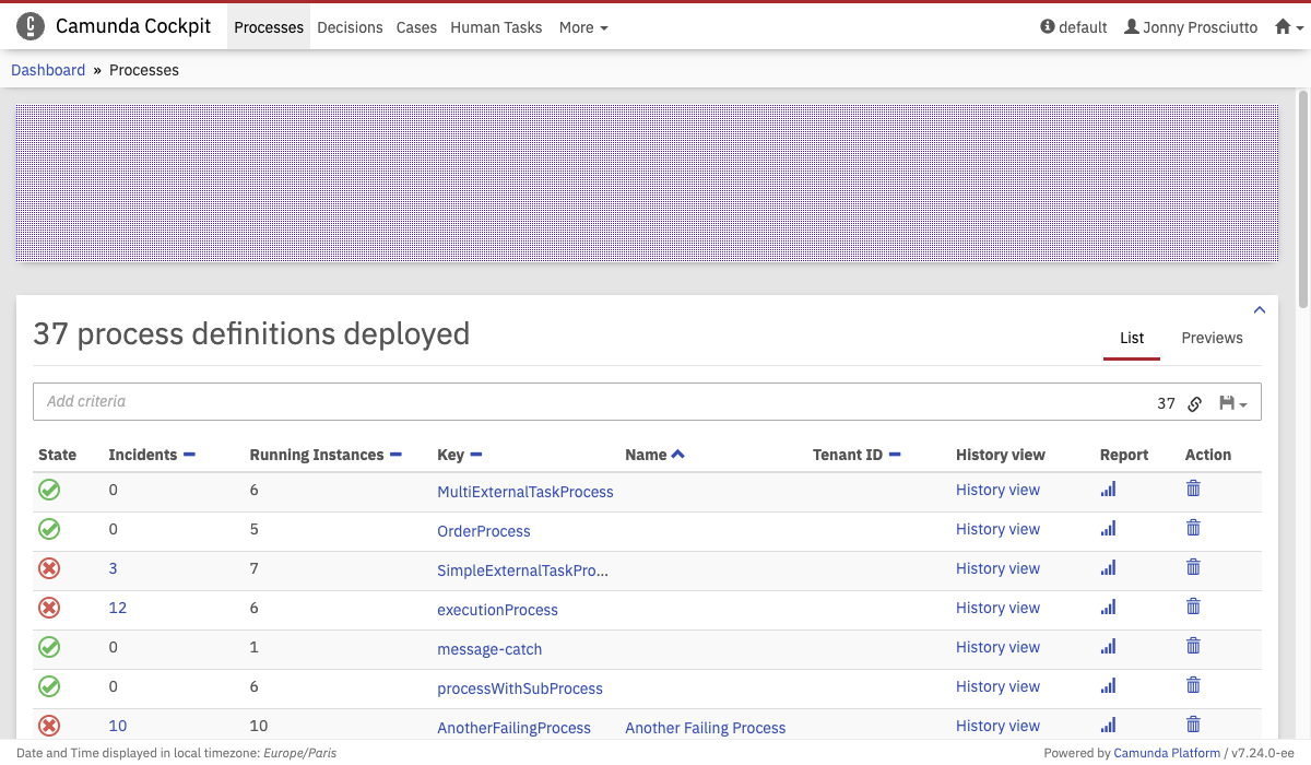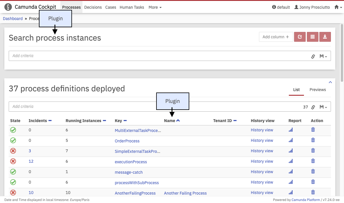 Cockpit defines a plugin concept to add own functionality without being forced to extend or hack the Cockpit web application. You can add plugins at various plugin points, e.g., the processes dashboard as shown in the following example: