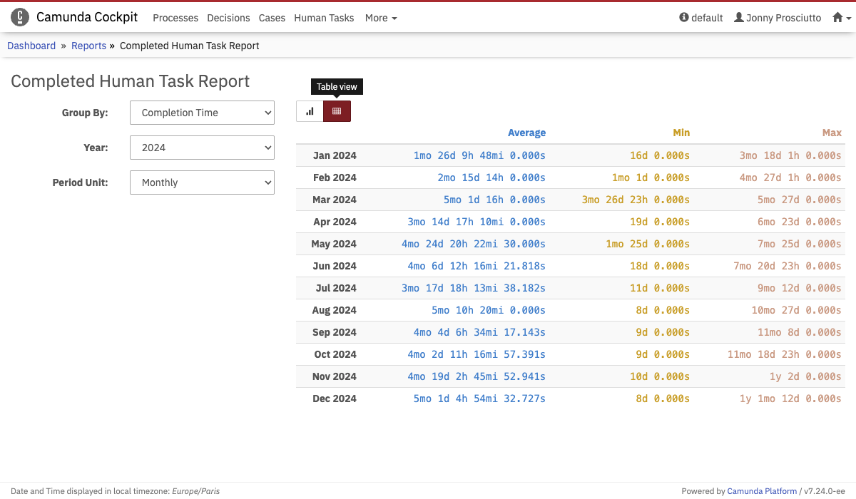This report shows the average, minimum and maximum duration for a selected process definition and version for a given timeframe. Monthly and quarterly aggregation of the duration times are supported. You can hover over a bar in the bars chart to see the exact values below the chart. You can also switch to the table view to see the exact values for every month or quarter.