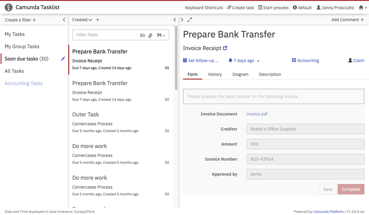 Tasklist is a web application that allows you to work on User Tasks. Tasklist is part of the Camunda 7 distribution and ready to use by opening http://localhost:8080/camunda/app/tasklist.