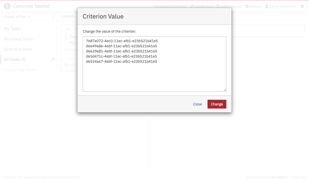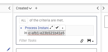Above the filter results, you have the option of searching for user tasks within the selected filter results. To do so, click in the search box and select the parameters to search for. You can also begin typing to find the required parameter faster. Depending on the selected property, you have to specify the value of the property. Some properties also allow operators other than equal, e.g., 'like'