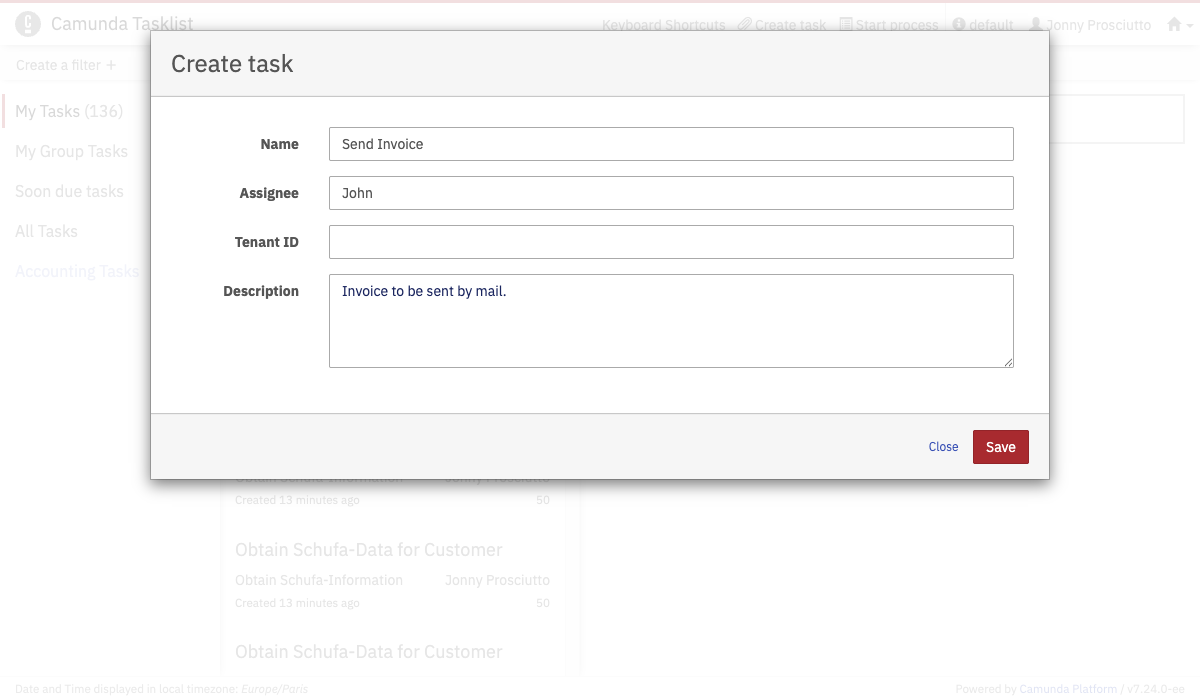 Tasklist offers you the possibility of creating standalone tasks. To do so, click on the Create task button. In the screen that appears, you can define a name of the task, the assignee and you can add a description. Once you click on Save, the task is created.