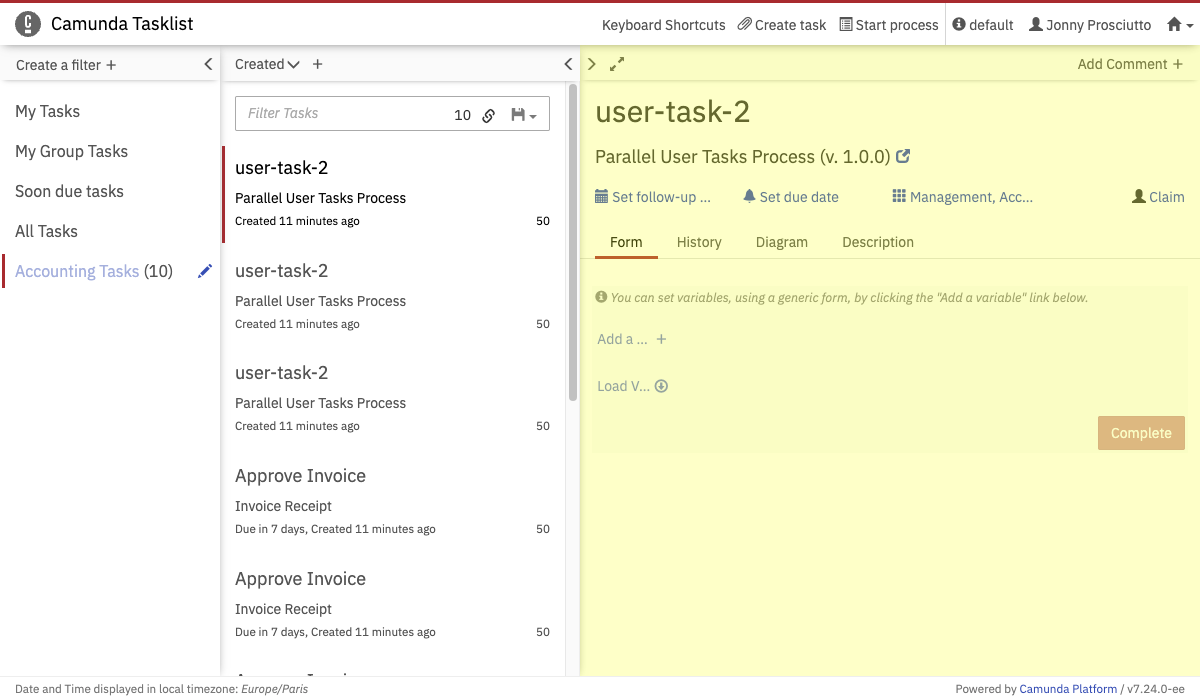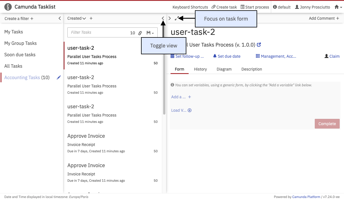 - Task form view - The Form tab, which is selected by default, displays the task form (provided that the task form is an embedded, generated or generic task form). Here you can work on and complete the task.