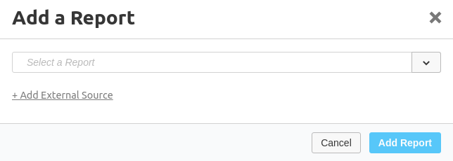 Once you have prepared all your reports, you can now start to assemble them into the dashboard. On the dashboard grid you will always find a Add a report button. Clicking on it, opens a modal, where you can select one of your defined reports and add it to the dashboard: