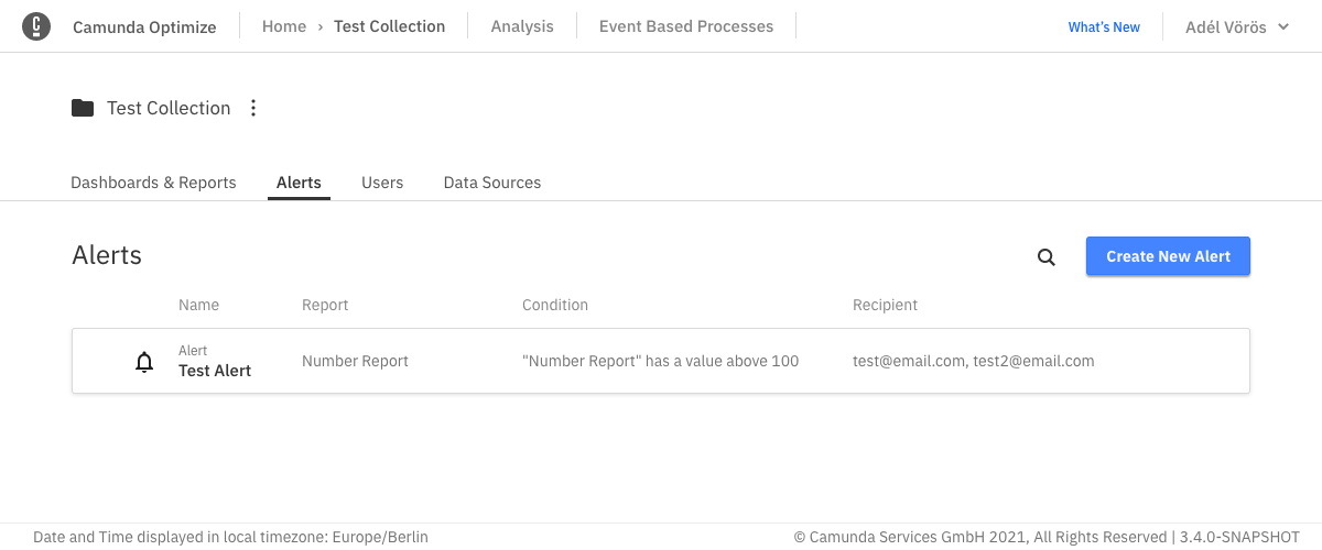 Optimize’s Alerting functionality can be used to notify you when your Report hits a predefined critical value. You can create Alerts for any number Reports that exist within a Collection. Inside the Collection, navigate to the “Alerts” tab to see all Alerts defined for Reports in this Collection. You can manage an Alert by moving the mouse over the Alert entry and clicking the edit or delete buttons in the context menu on the right-hand side.