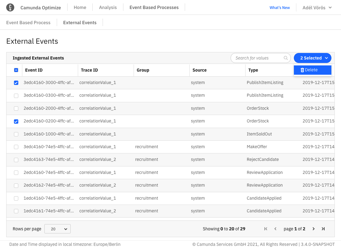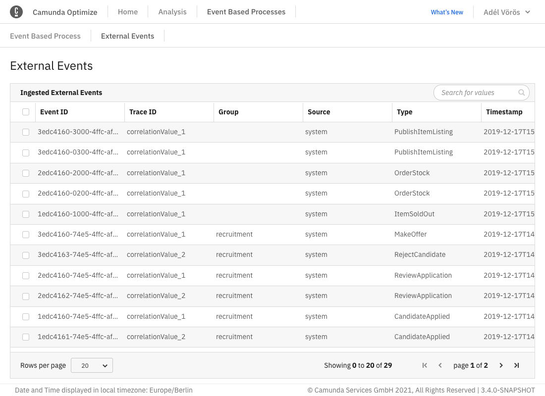These are events generated from an existing Camunda BPMN process. Only processes for which Optimize has imported at least one event will be visible for selection. This means that the process has to have at least one instance and that Optimize has to have been configured to import data from that process. Please see the technical guide for more information on how this is configured.