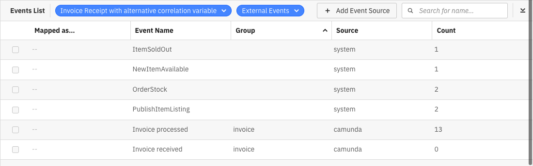 - For events from Camunda processes, the count value represents the number of times that event has occurred across all versions and tenants of that process, regardless of how the event source is configured.