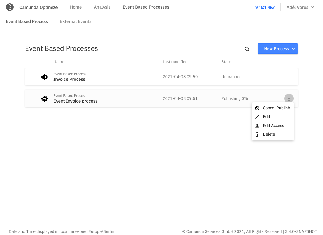 All currently available Event Based Processes are listed under the main navigation item Event Based Processes. From there it is possible to see their state, which can be one of the following: