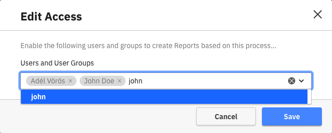 In this modal, it is possible to search for users and groups and add them to the list of users who have access to the process. Once that is done, you can save the changes and publish your process.