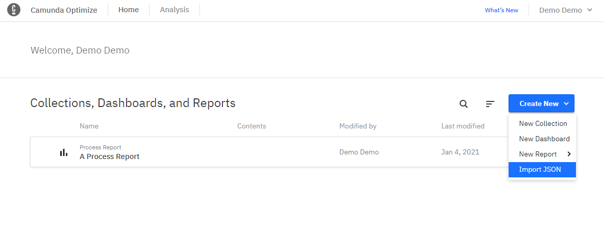 With Optimize 3.3.0, a new exporting/importing feature has been added to Optimize. Currently, this feature is limited to Reports and Dashboards, but in the future users will be able to export and import Collections as well. Please note that for now, only superusers are authorized to export and import Optimize entities.