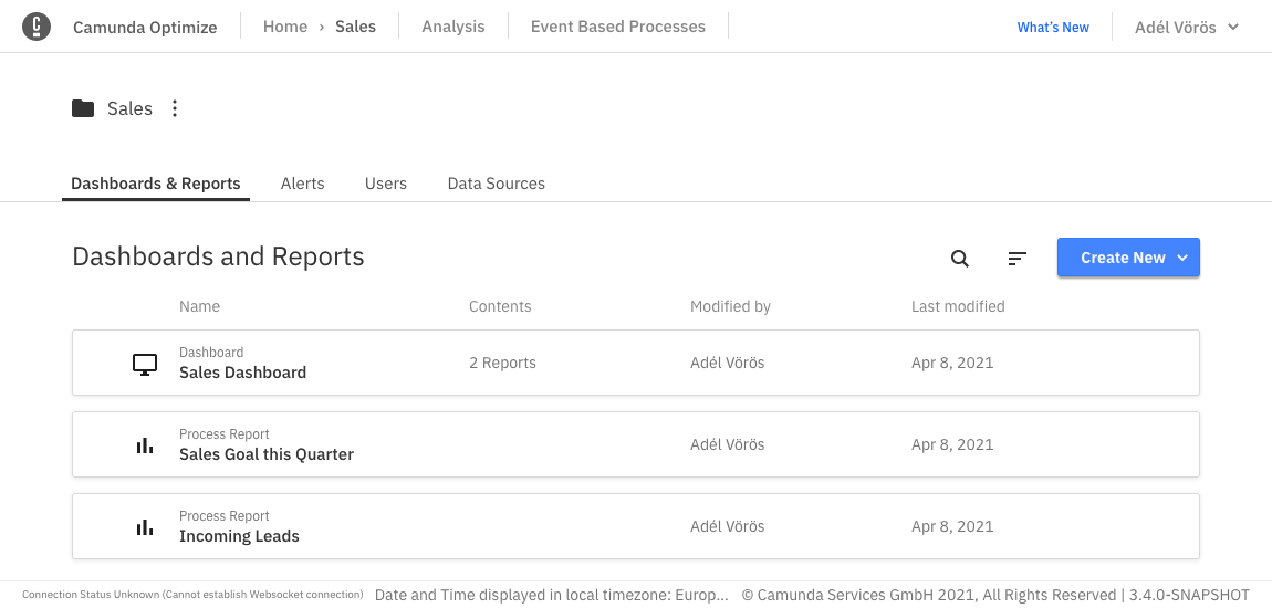 To create a Dashboard or a Report, you can use the ‘Create New’ Button available on the top right corner.
