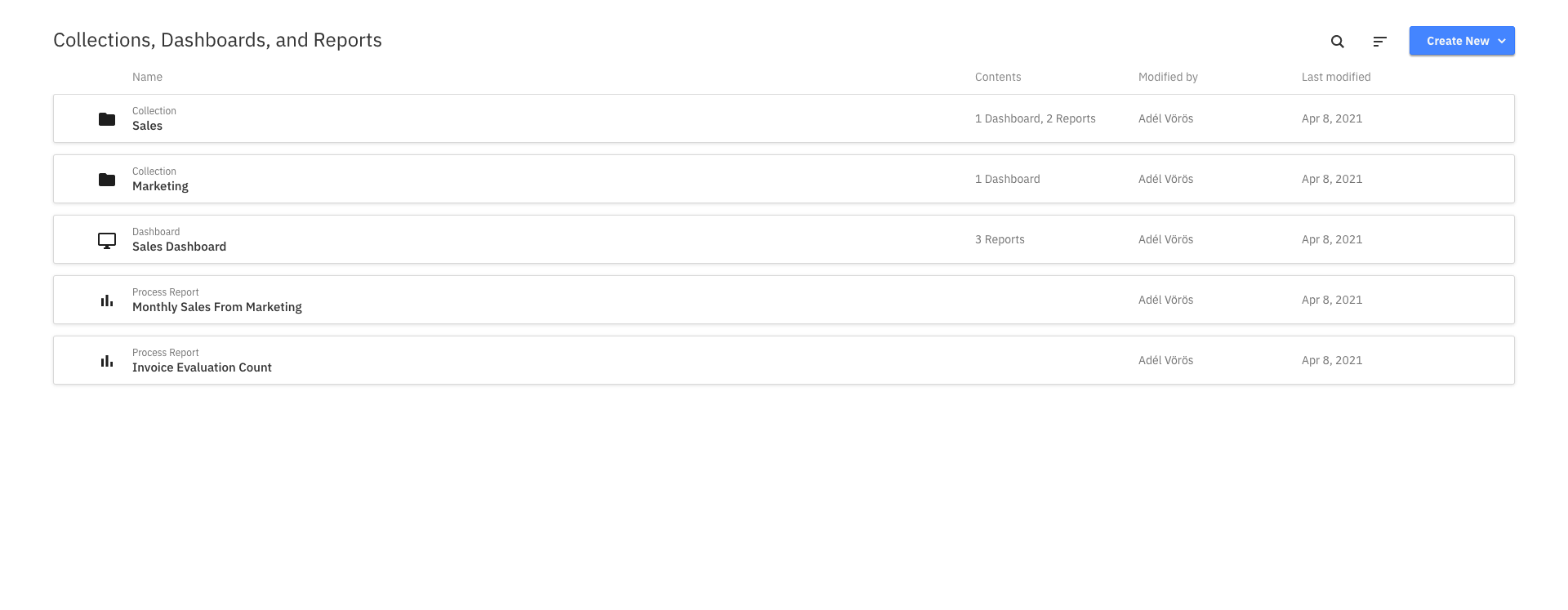 The Optimize homepage shows a list of all Dashboards and Reports you created as well as Collections you have access to. At the top of the list you see the Collections you can access, followed by Dashboards and Reports. Dashboards and Reports that are inside a Collection are not displayed at this level.