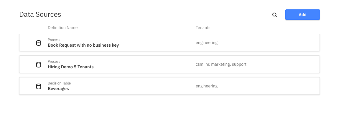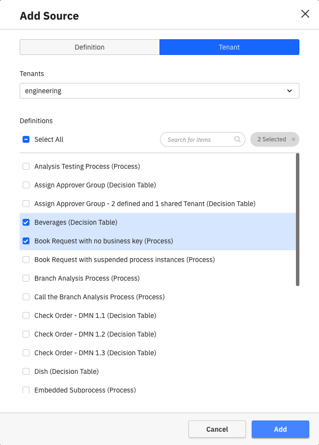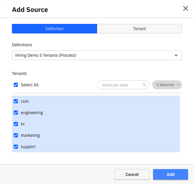 Using the Add button, a Manager can add one or more sources to the Collection. To make it easier to add sources, there are multiple ways to do that. One way is to select a definition that you would like to add and then select one or more tenants for that definition.