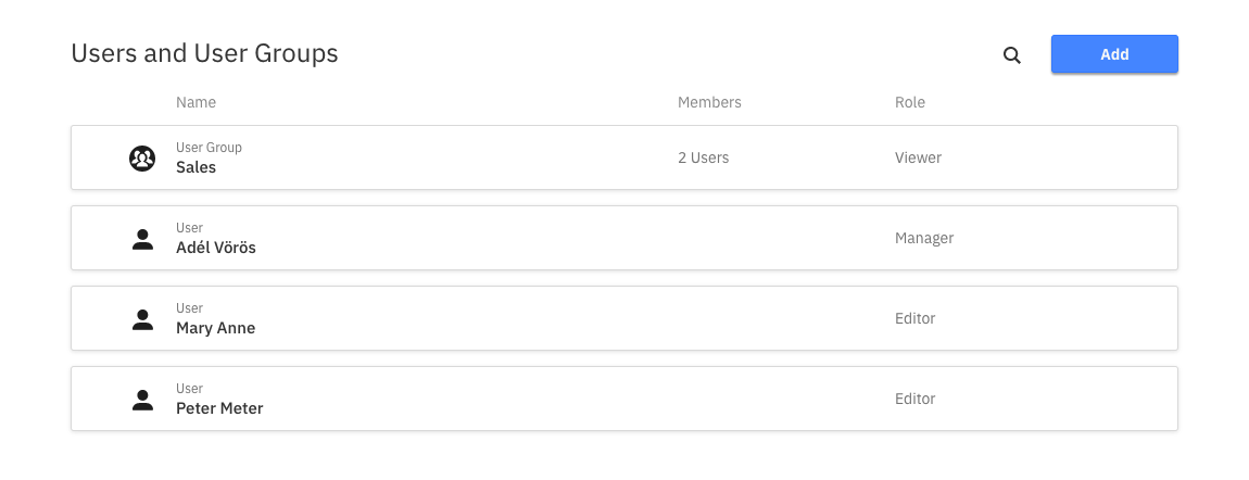 Using the Add button a Manager can add a new user or group to the Collection. Use the ID of the user/group to add them. Every user/group has a role assigned to them that specifies their access rights to the Collection. The Viewer role allows the user/group to only see the Collection and entities contained within. They are not allowed to edit or delete existing Dashboards and Reports in the Collection and they cannot create new entities in the Collection. They are also not allowed to rename or delete the Collection itself or change anything in the Users tab.