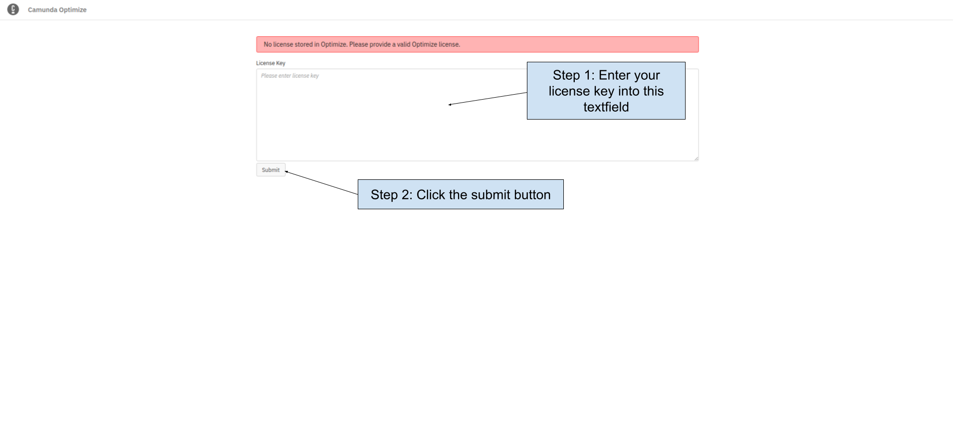 Here you can enter your license key to be able to use Camunda Optimize.