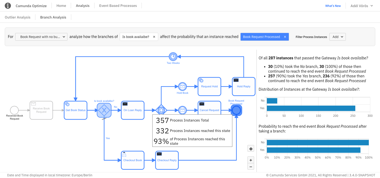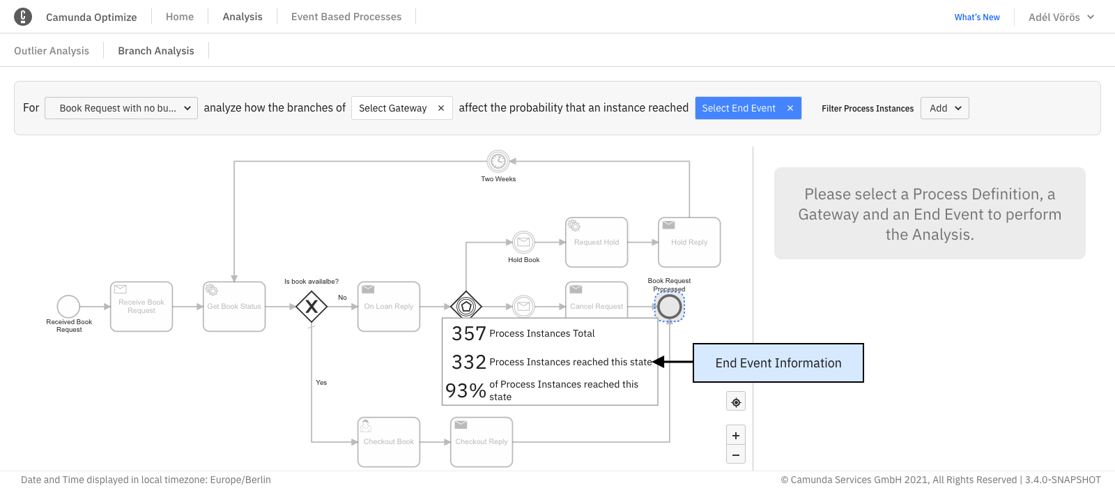 If a process contains more than one end event, it is useful to know which path tokens took to reach a specific end event. Camunda Optimize can provide you with a statistical analysis for a given end event and a gateway. This analysis includes how tokens were split at the gateway in question and how many of the tokens of each branch reached the end event.