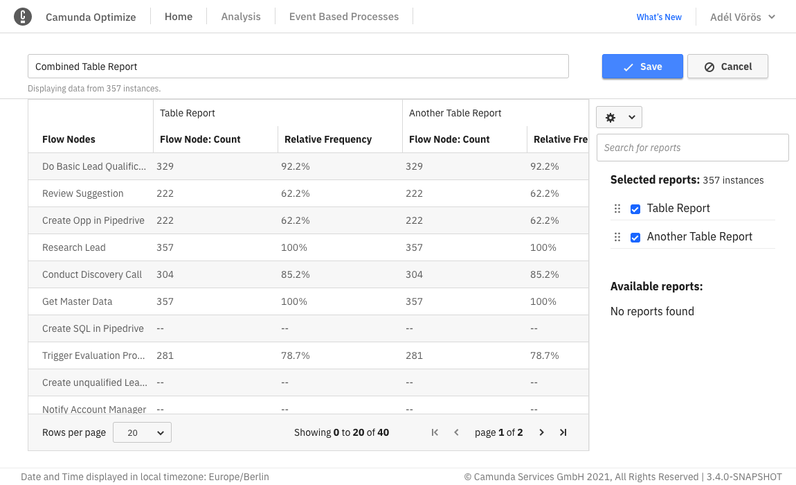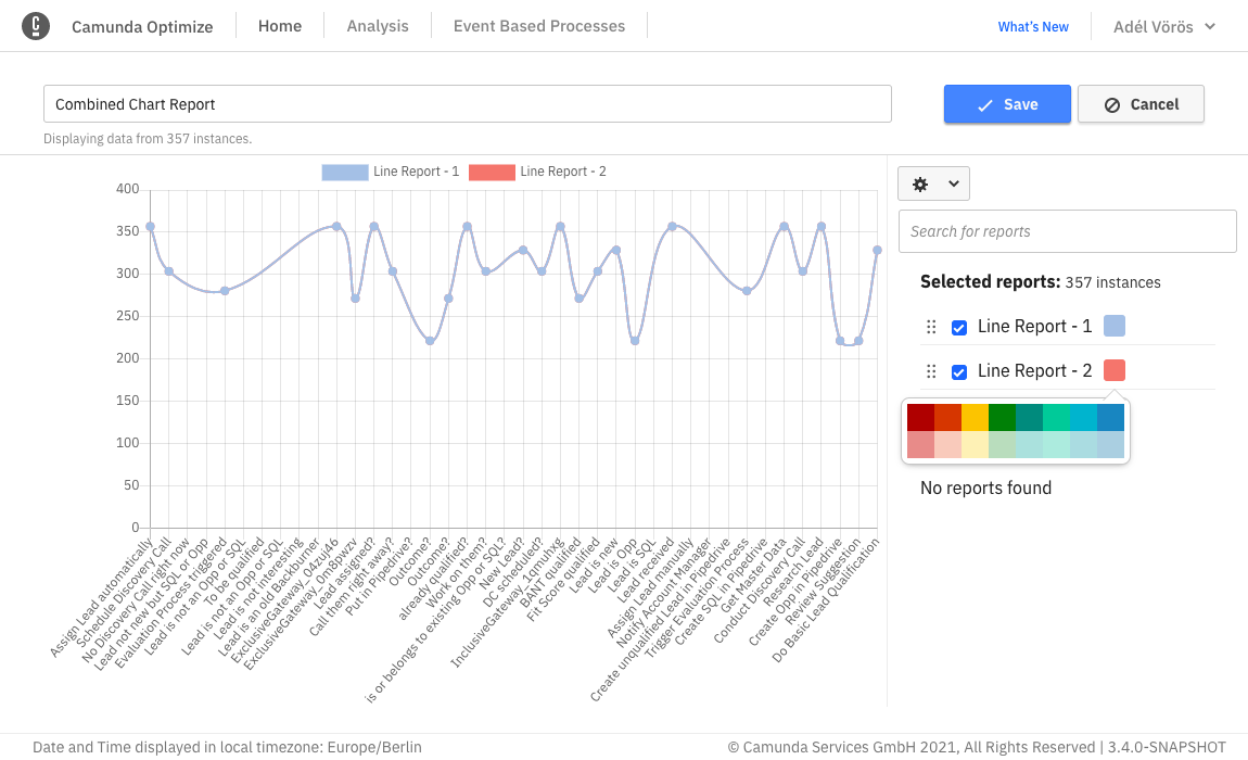 - Multi-Measure Reports, including Reports containing multiple aggregations or multiple User Task duration times cannot be combined