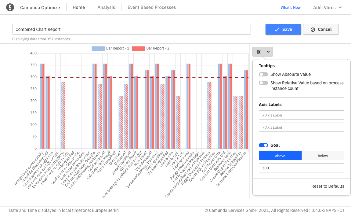 For example, in all chart Reports, you can change what to show in the tooltips, change the axis names and set a goal line as shown in the figure below.