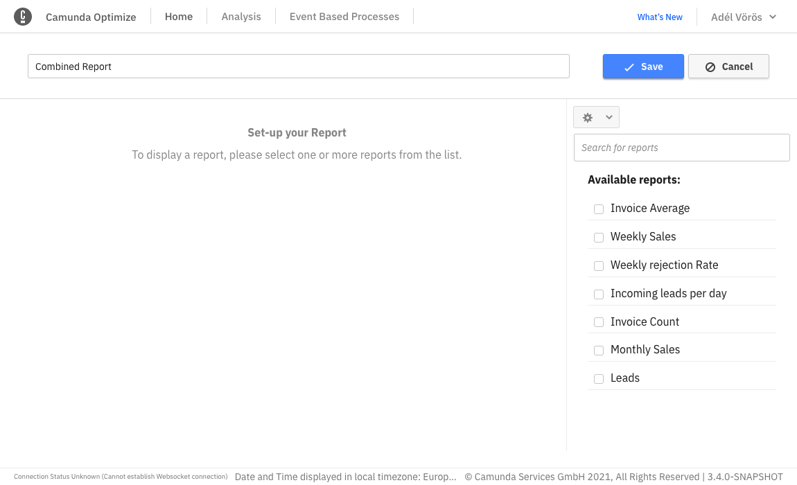 Please note that not all Reports can be combined with each other since differences in their configurations, e.g. a different visualization, may make them incompatible. Therefore, when selecting a Report, only the other Reports that are combinable with the selected one will appear.