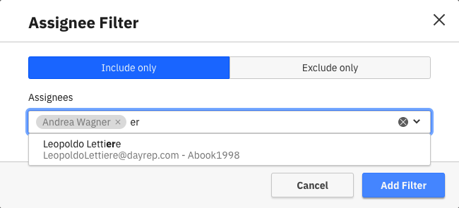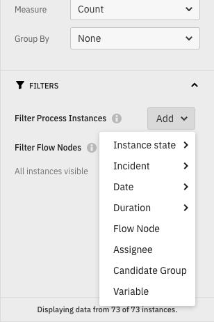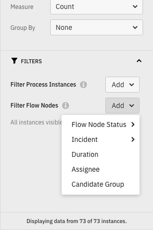 These filters allow you to include or exclude instances based on the assignee or the candidate group of at least one User Task of a particular process instance.