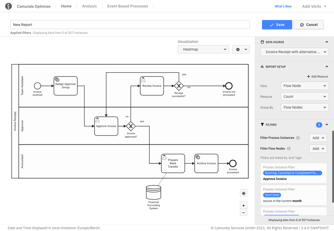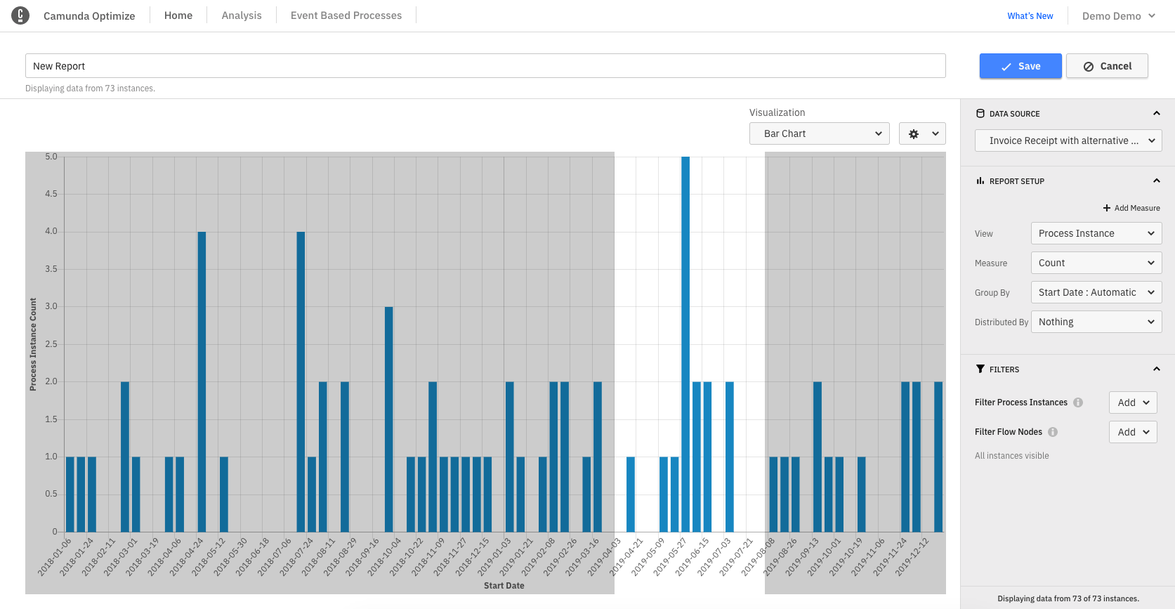 By default, a Report considers all process instances, regardless of whether they are suspended or not. Adding this filter makes it possible to only evaluate process instances that are in the suspension state. Please note that if you have enabled history cleanup, this might affect the accuracy of this filer since the suspension state is imported from historic data. More information on the limitations that exist for the suspended instances filter can be found in the upgrade notes.